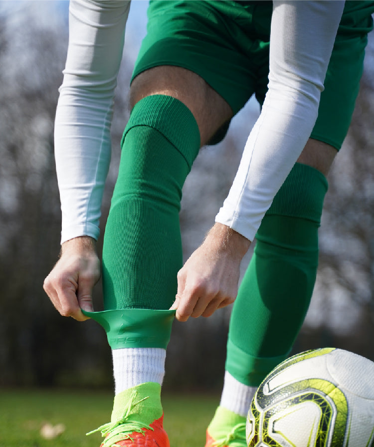 At the bottom their diameter is smaller than further up, it is called a conical geometry. The material used is high-quality silicone, which is extremely elastic and adheres to almost all surfaces. This adhesion strength is reinforced by a smooth inner surface of the shin guard holders. The holders are ribbon-shaped and therefore self-contained. This guarantees that they will not open during the game. The Grip Tapes can be pulled on up to an inner diameter of 30 cm.